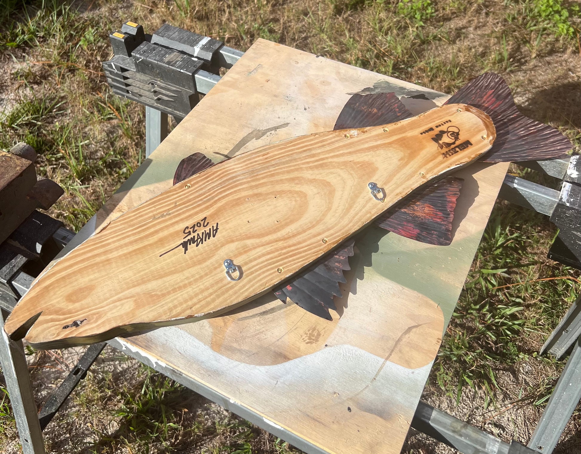 This is a Woodcarved 32” Snook Trade sign created in a vintage style. Distressed wood and paint with hammered copper fins. Perfect for a shop or man cave to let you know where your beer fridge is..🤪 Carved from a live edge pine board. signed and dated 2025.