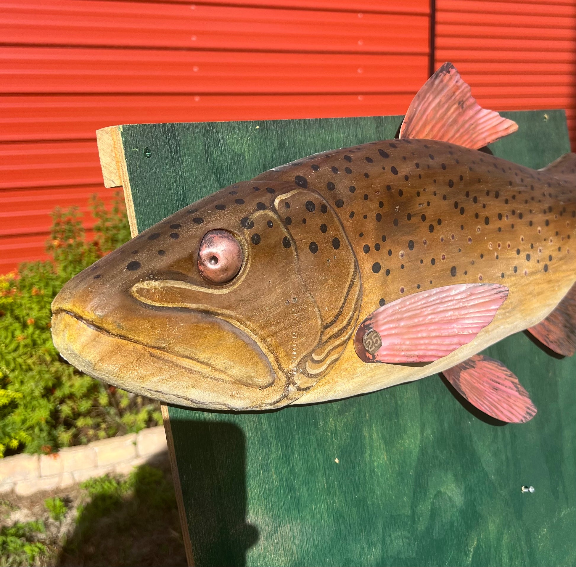 34” Woodcarved Brown Trout Trade sign created in a vintage style. Worn paint, beat up wood and aged, hammered copper fins. Eye is also copper. The wood is Live Edge pine. Signed and dated 2025