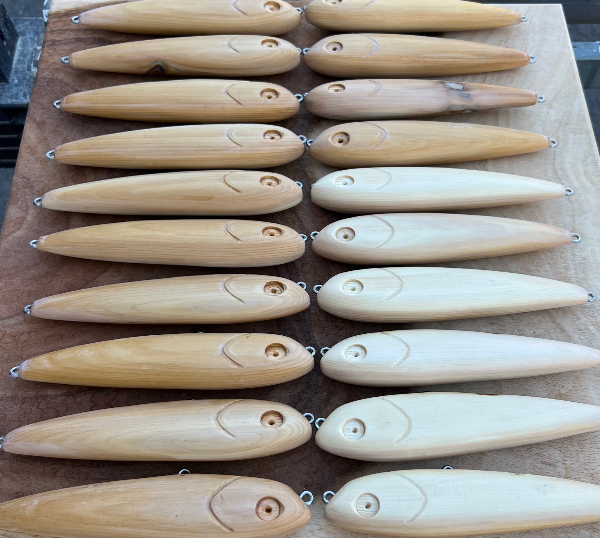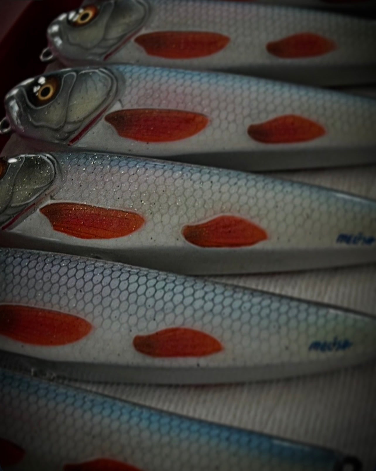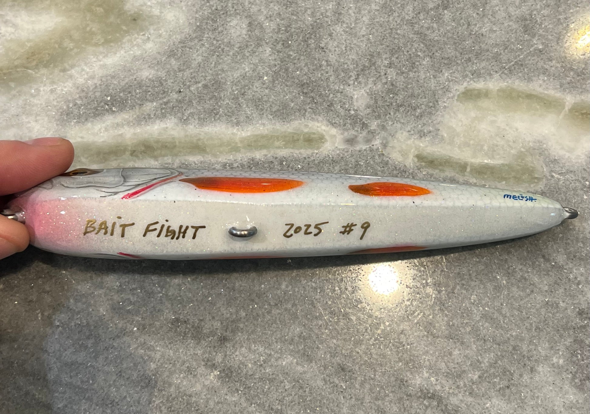 Bait F*GHT fishing expo exclusive Woodcarved white cedar bait. 7”, 3.5oz. Rise and glide. Works like a euro style glide but rises and glides on the jerk. Sinks horizontal with a really sweet flash and wobble on the stall. Comes equipped with Handpainted glass eyes and high quality 1/0 trebles. Only created 20 total. Signed, dated and numbered. You will receive a numbered bait 1 of 20.
